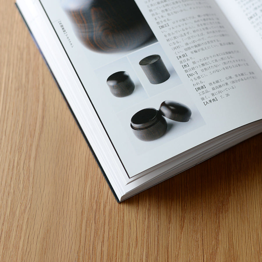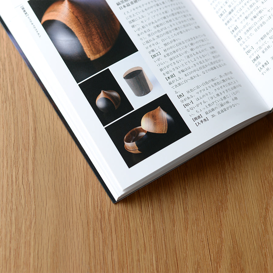 木材見本写真は、木工家・河村寿昌が木工ロクロで挽いて作った小箱を使用。