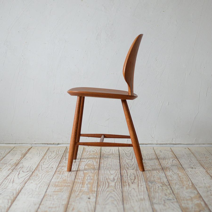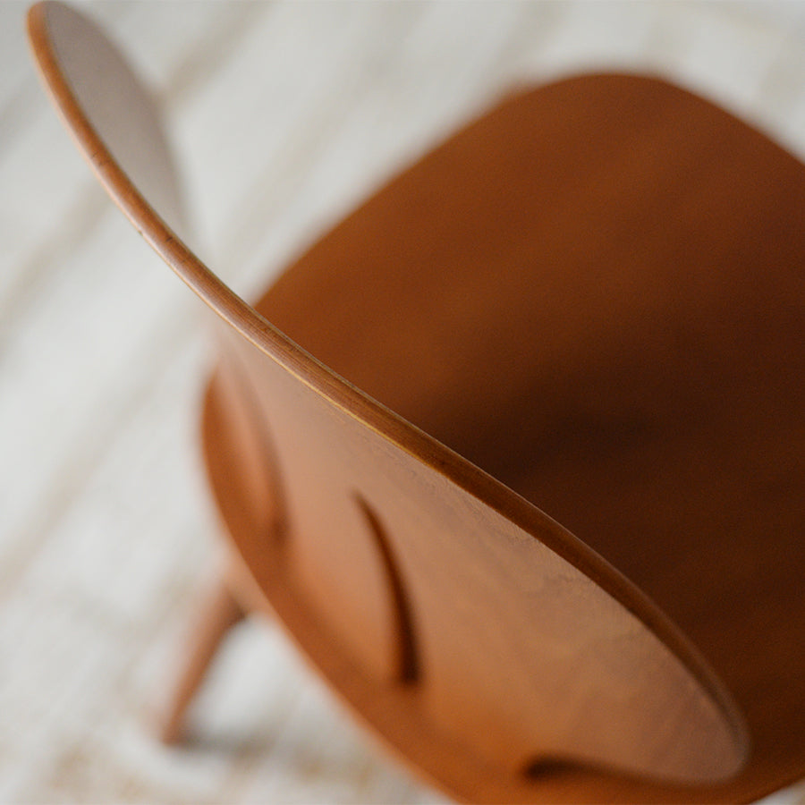 前回に引き続き自分好みのヌメ革指定にて丁寧に張り替えてもらいました。椅子本体は貴重なローズウッド材で個性的な木目と質感に満足しています。また、アームと脚の接合部分の美しさは別格です。