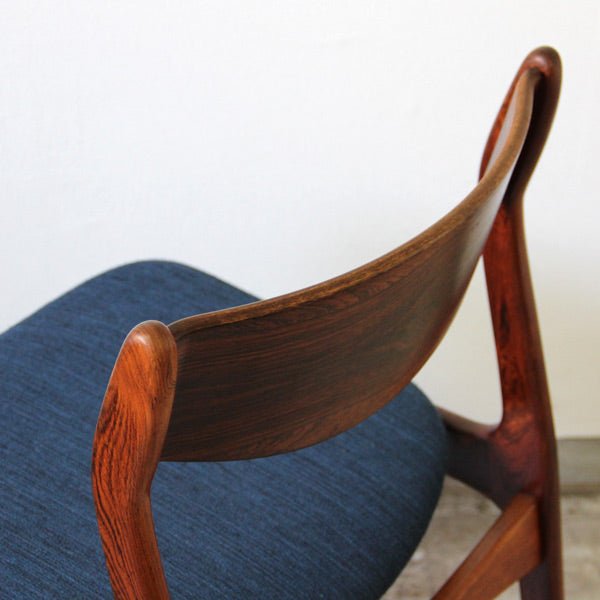 前回に引き続き自分好みのヌメ革指定にて丁寧に張り替えてもらいました。椅子本体は貴重なローズウッド材で個性的な木目と質感に満足しています。また、アームと脚の接合部分の美しさは別格です。