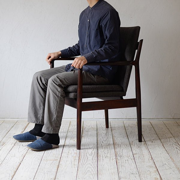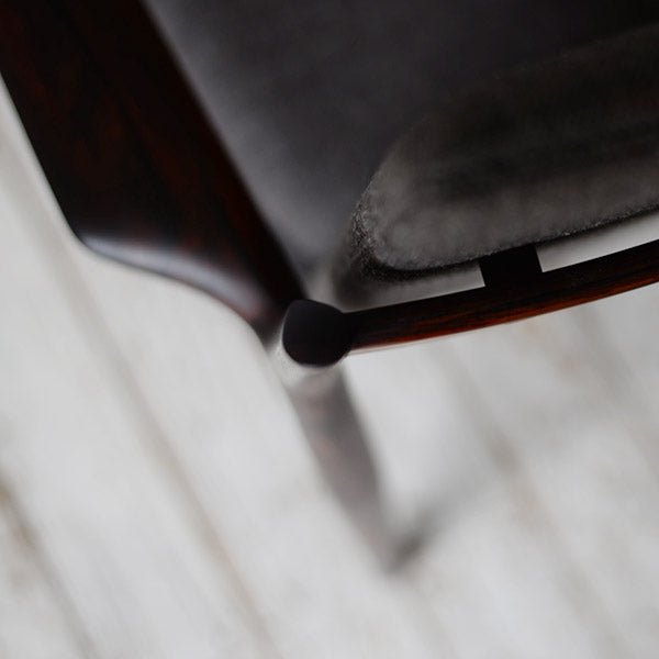 前回に引き続き自分好みのヌメ革指定にて丁寧に張り替えてもらいました。椅子本体は貴重なローズウッド材で個性的な木目と質感に満足しています。また、アームと脚の接合部分の美しさは別格です。