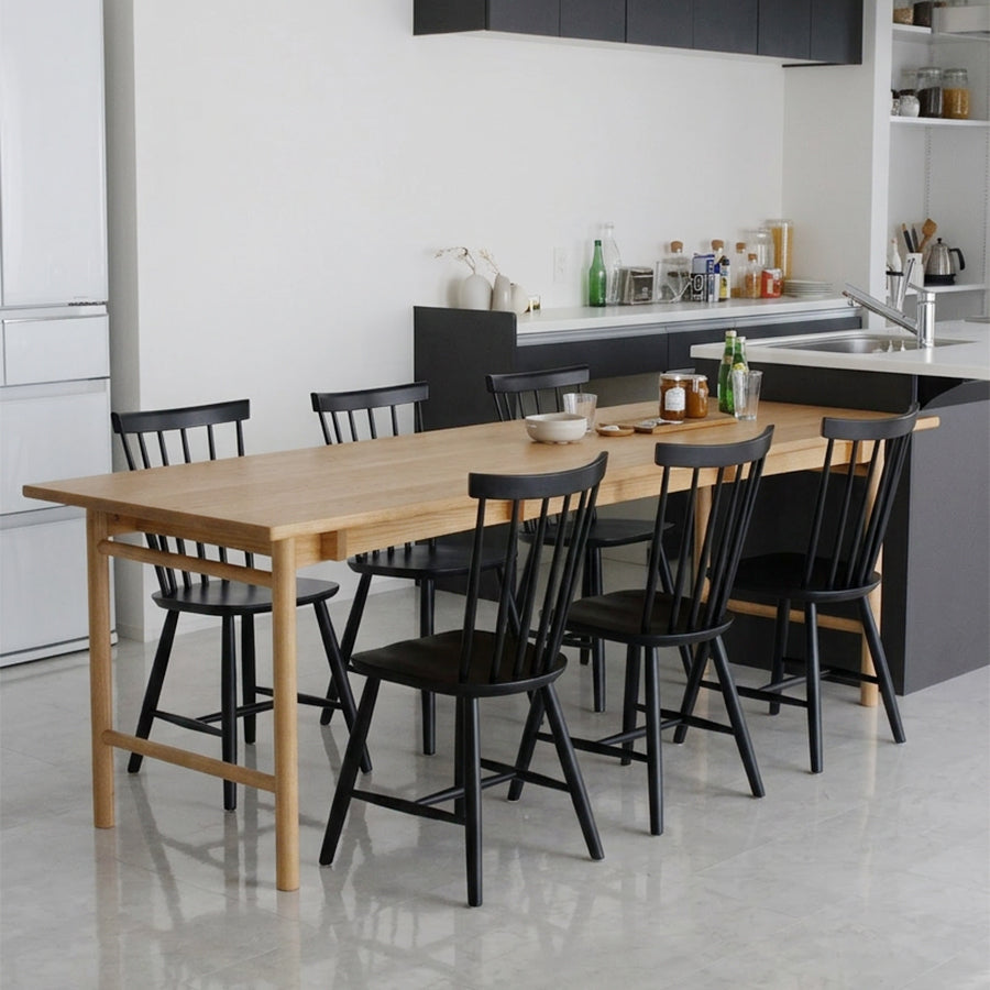 ブラック×ナチュラルで揃えたチェアが空間の輪郭を引き締め、オークの無垢天板がやわらかな素材感を添え、