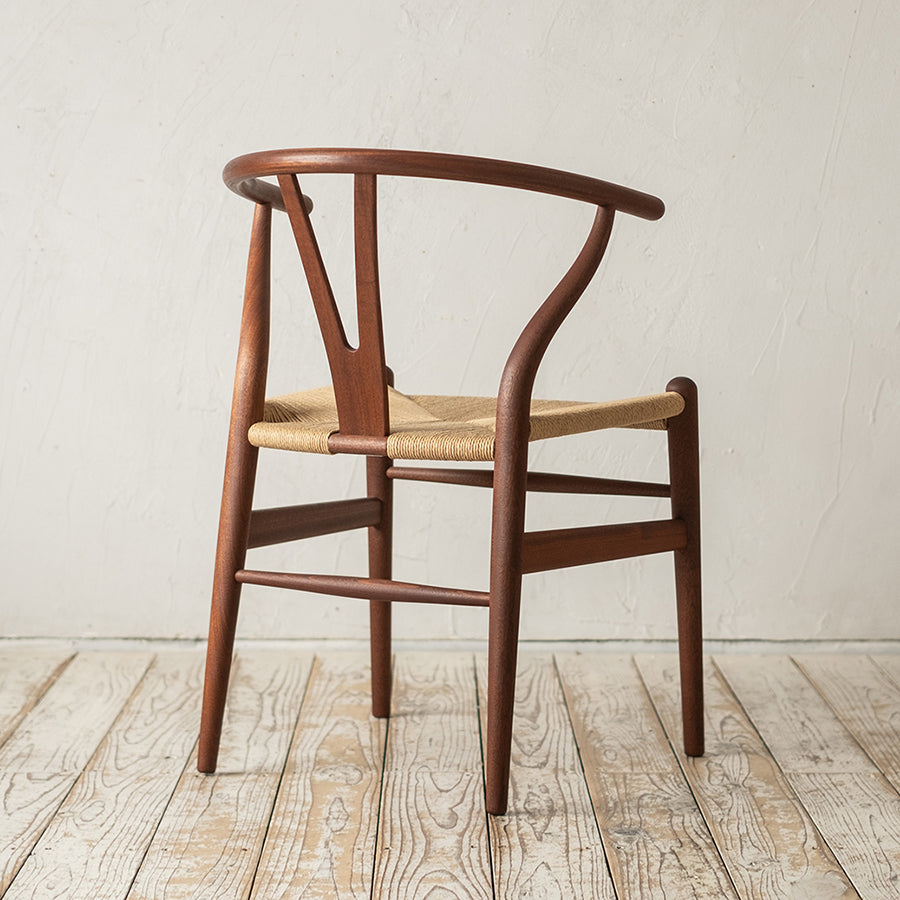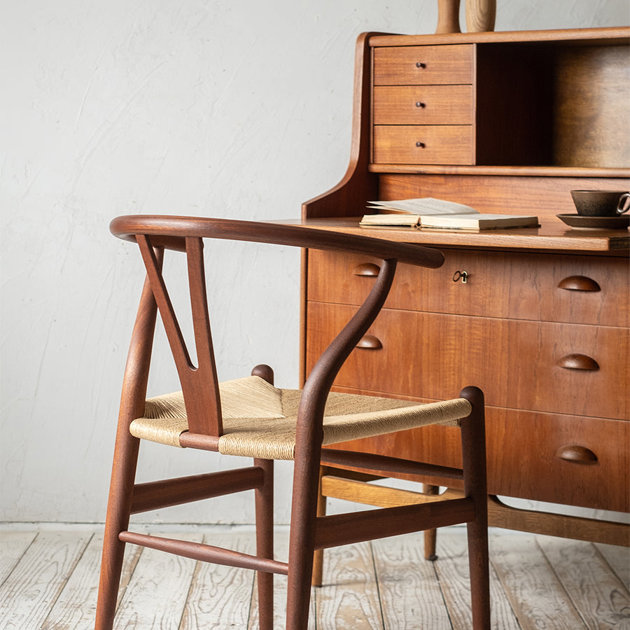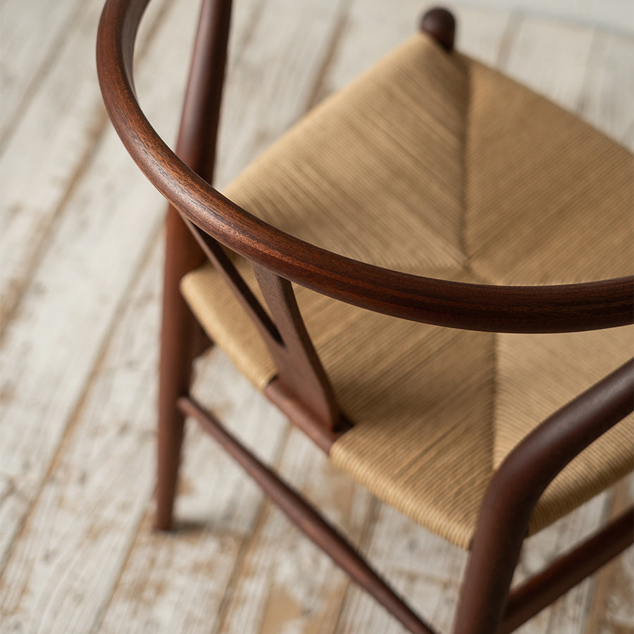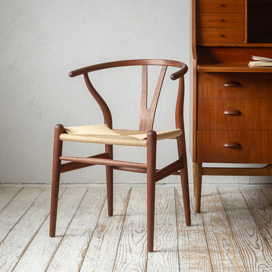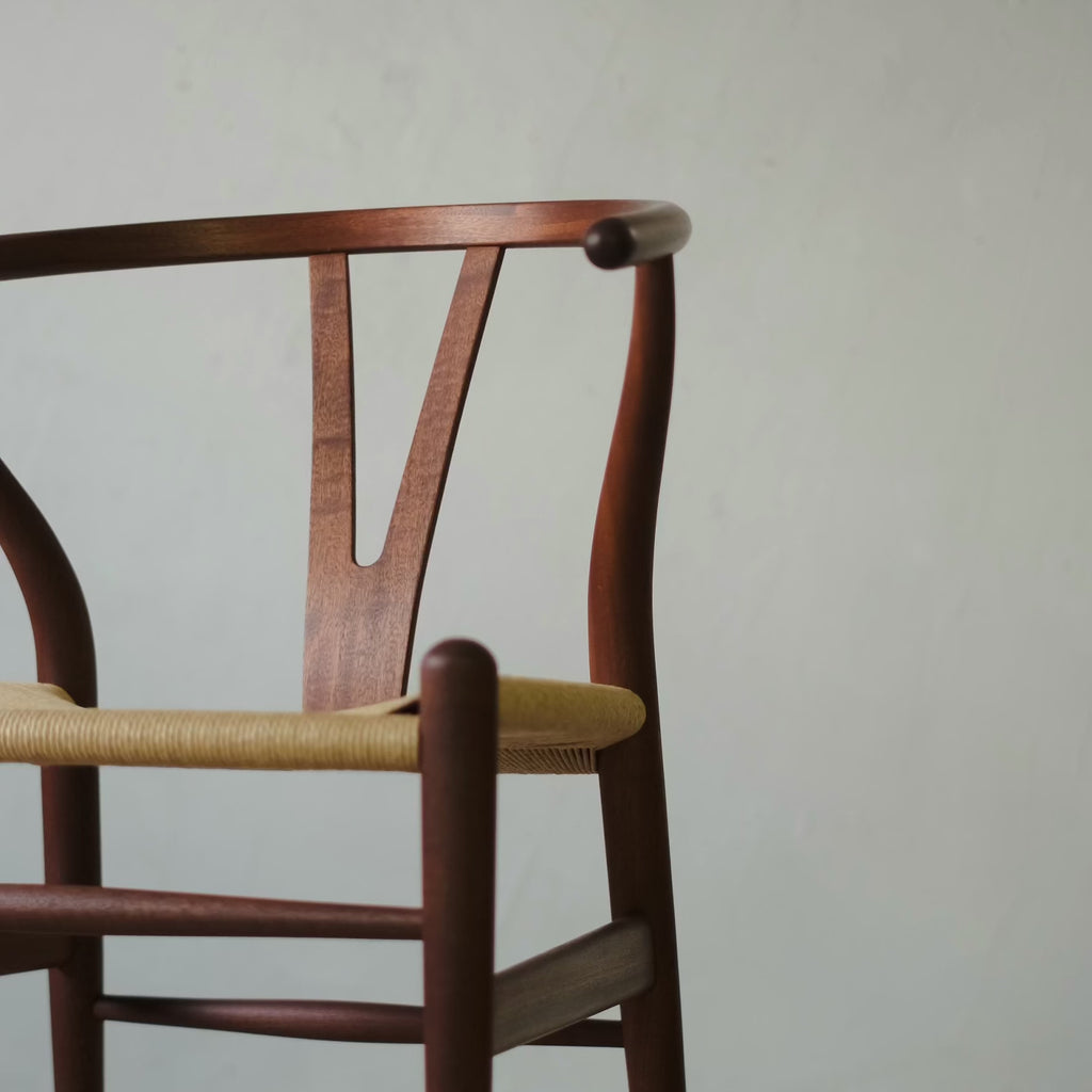 CH24、通称Yチェアは古典的とも言える、美しい彫刻的なフォルムを持つダイニングチェアです。そのルーツが中国明時代の椅子をリデザインしたチャイニーズチェア(1943,1944)にあることは広く知られています。'Yチェア'という名前は正式な名称ではありませんが、背もたれの特徴的な形状のパーツから誰からともなくそう呼ばれるようになりました。ヨーロッパでは'ウィッシュボーンチェア'の愛称で親しまれています。