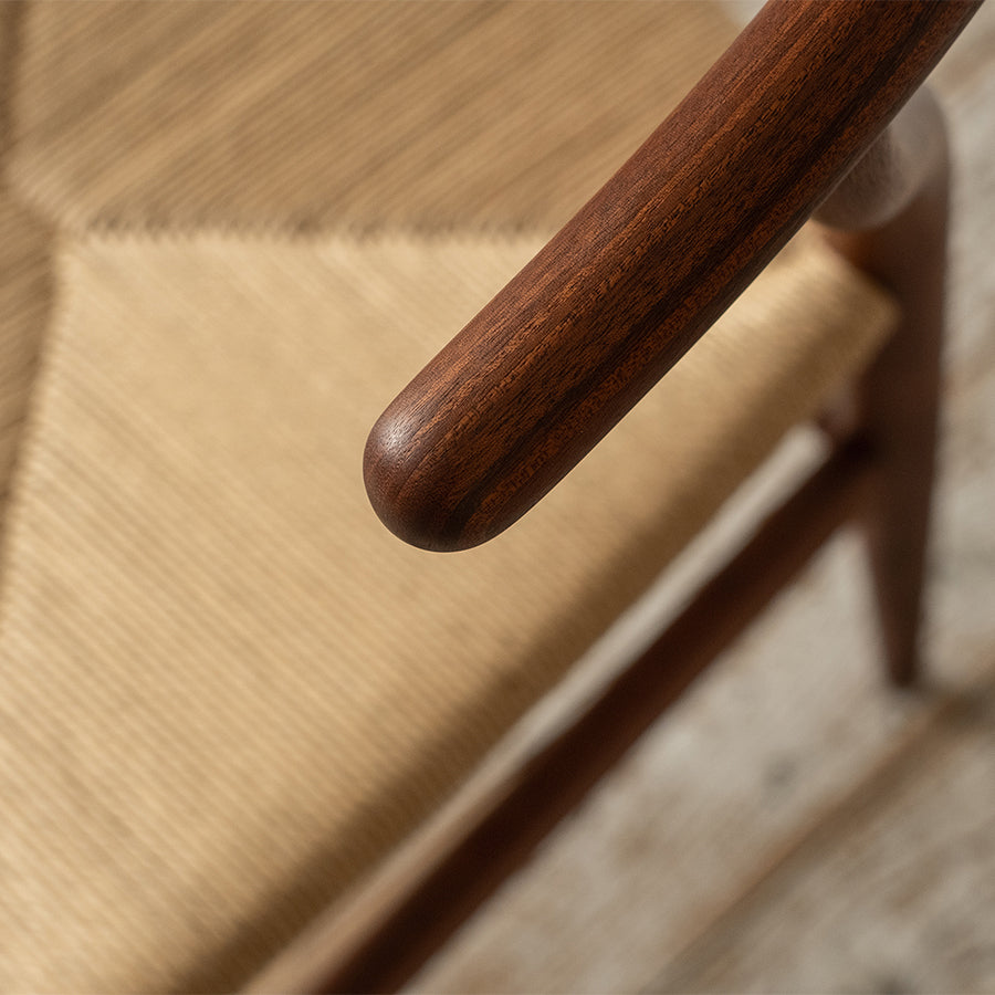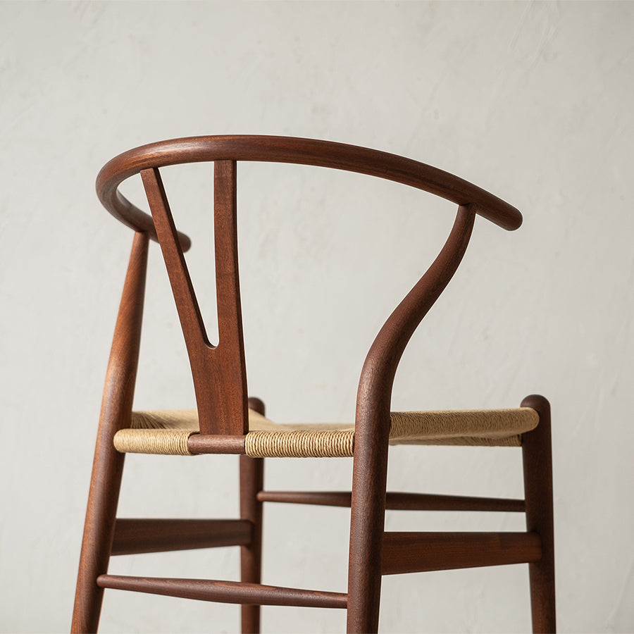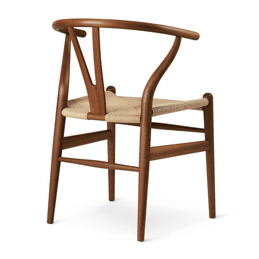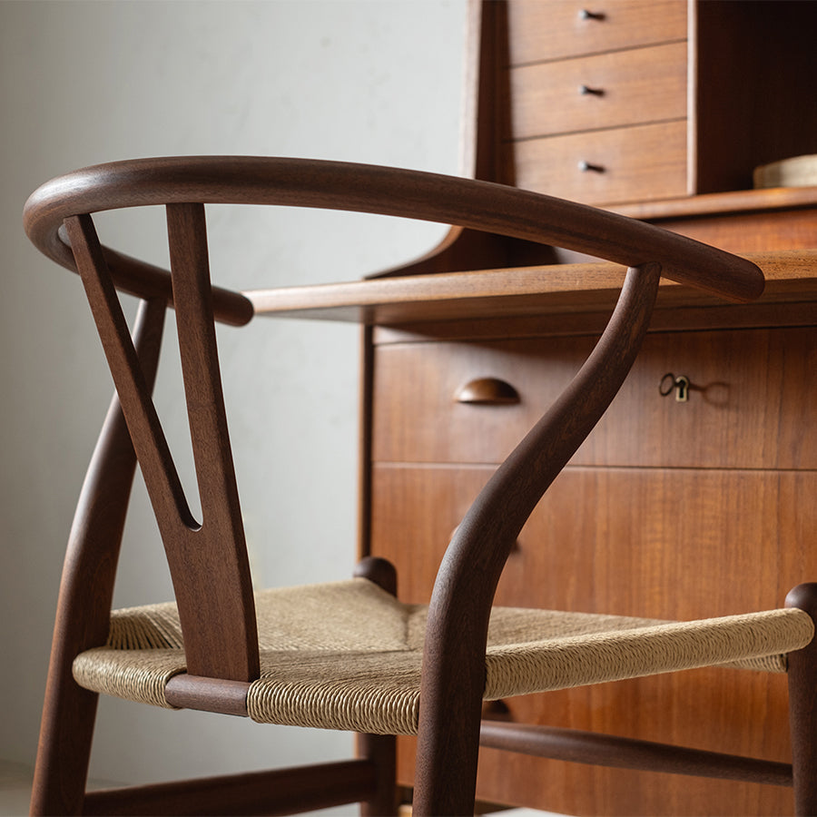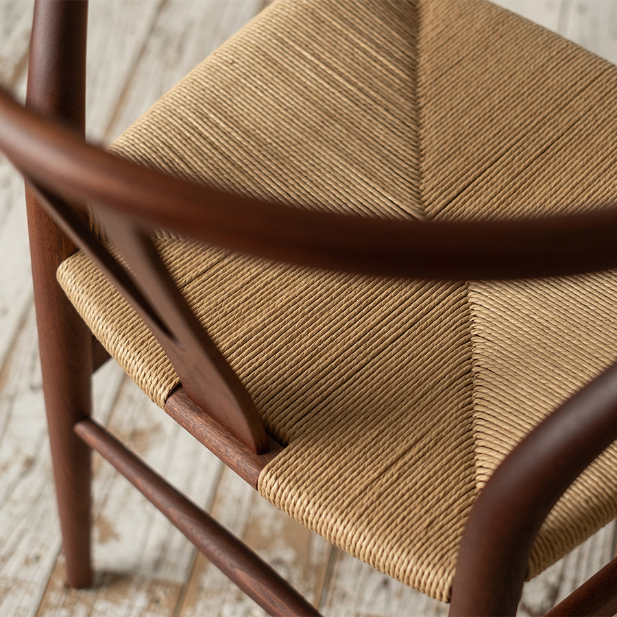 CH24、通称Yチェアは古典的とも言える、美しい彫刻的なフォルムを持つダイニングチェアです。そのルーツが中国明時代の椅子をリデザインしたチャイニーズチェア(1943,1944)にあることは広く知られています。'Yチェア'という名前は正式な名称ではありませんが、背もたれの特徴的な形状のパーツから誰からともなくそう呼ばれるようになりました。ヨーロッパでは'ウィッシュボーンチェア'の愛称で親しまれています。