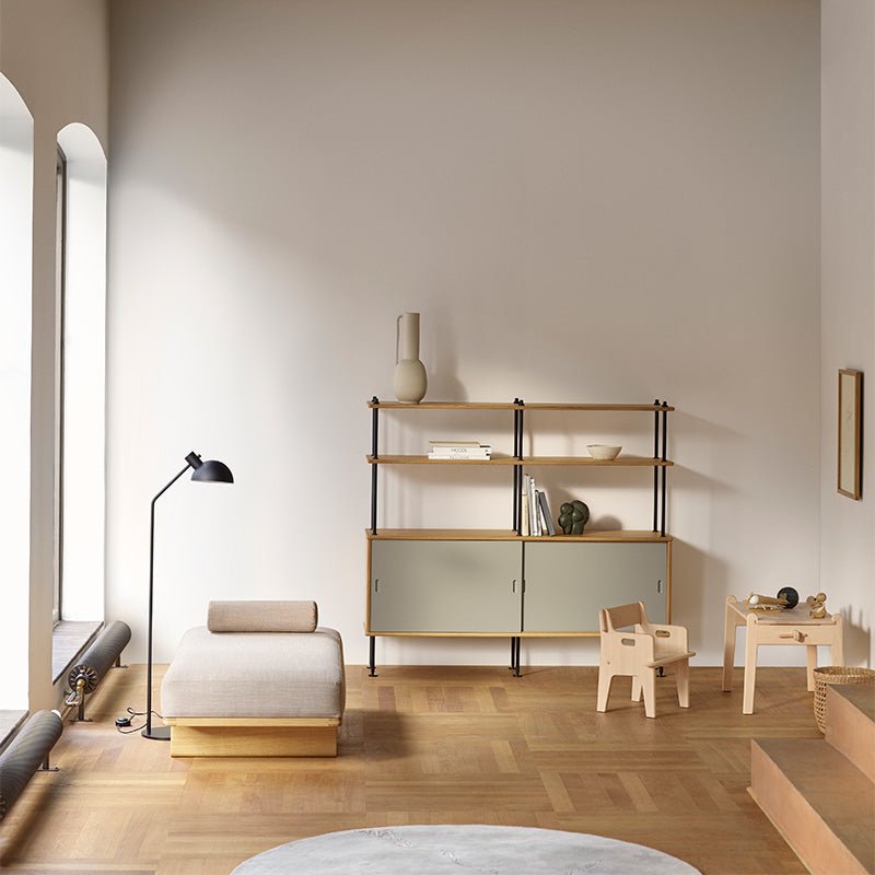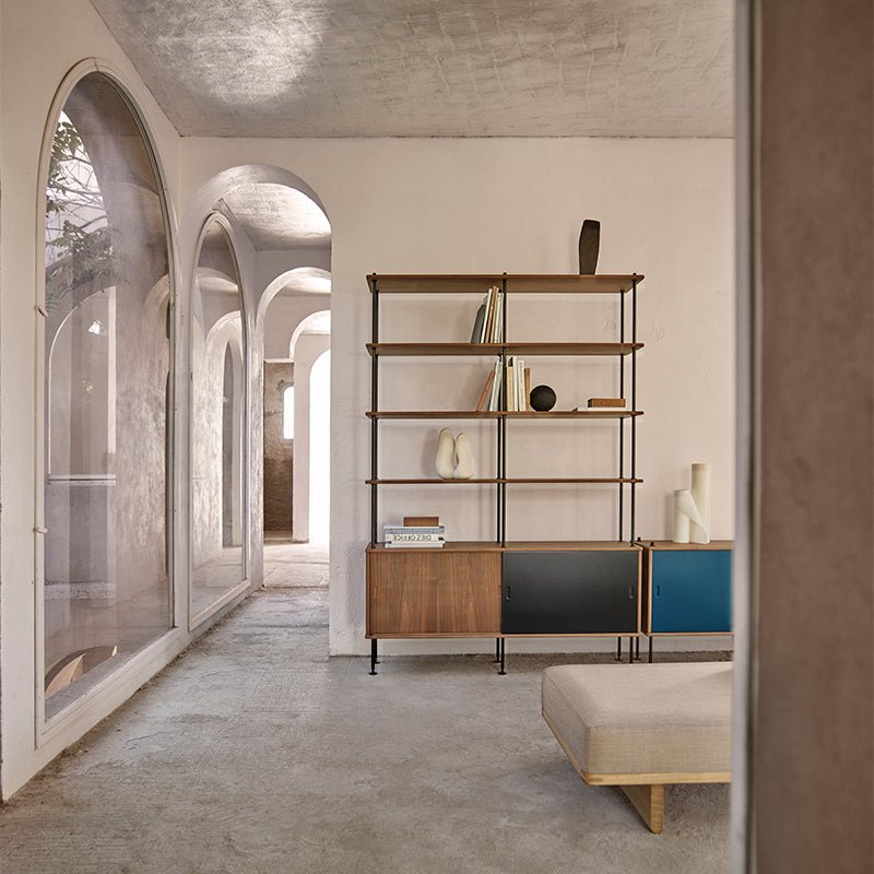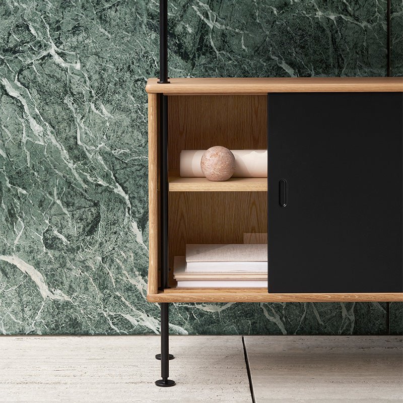 ディスプレイ棚として開放感ある見せる収納にも、スライドドア付きのキャビネットで隠す収納にも対応し、空間にリズムとメリハリを与えます。