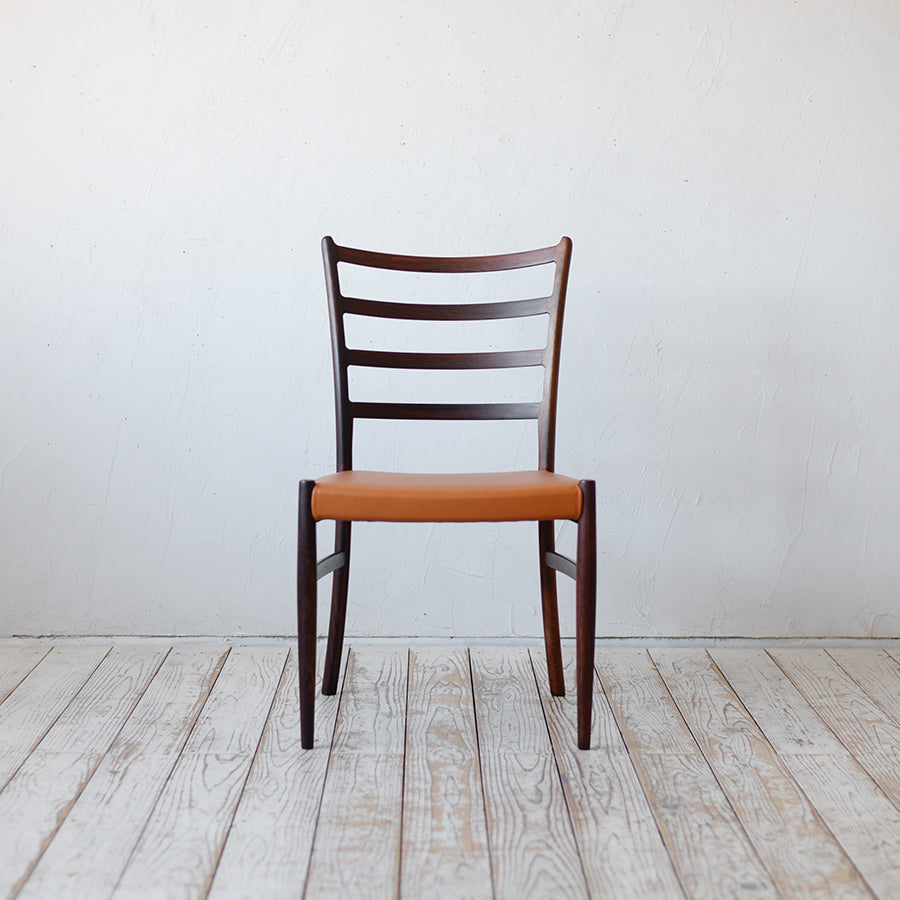 前回に引き続き自分好みのヌメ革指定にて丁寧に張り替えてもらいました。椅子本体は貴重なローズウッド材で個性的な木目と質感に満足しています。また、アームと脚の接合部分の美しさは別格です。