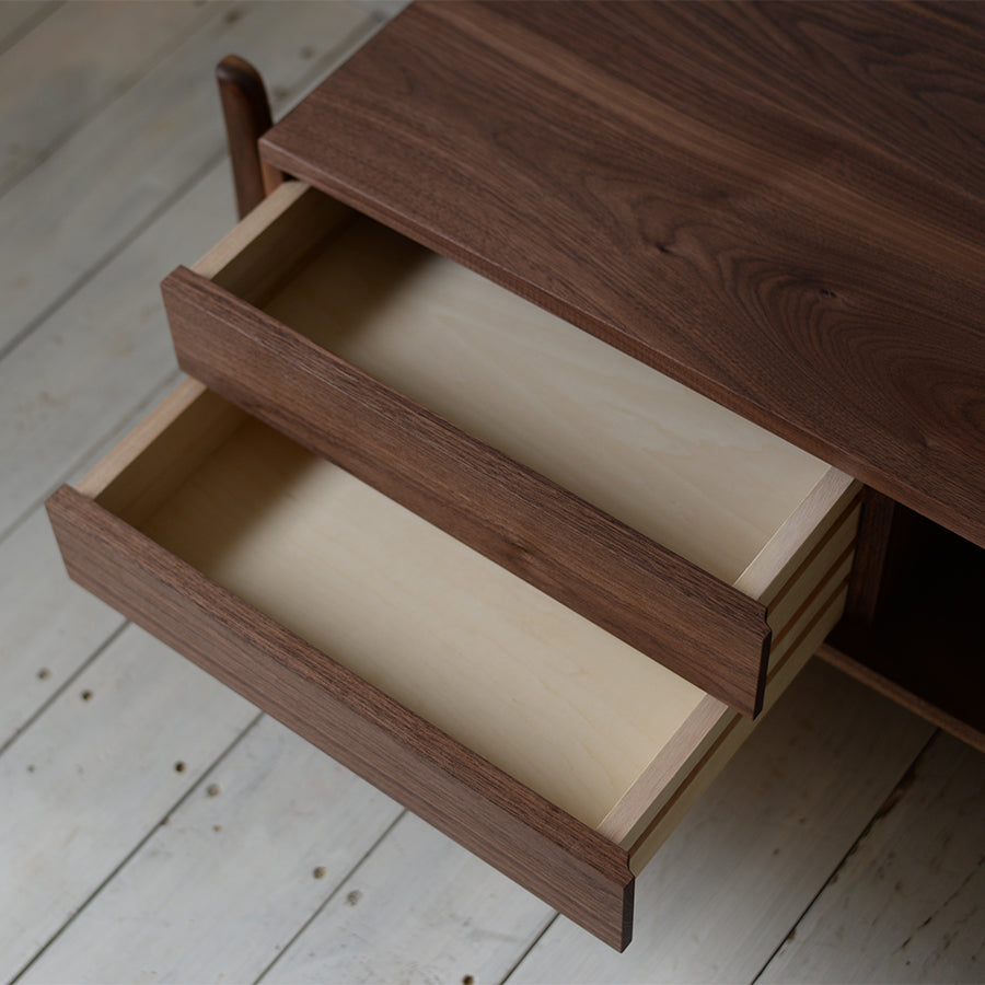 左側は浅めの抽斗が2段。リモコンやケーブルなど、小物の収納に便利です。右側は深めの抽斗が1段。DVDやCDなどのディスクもしっかり収まります。