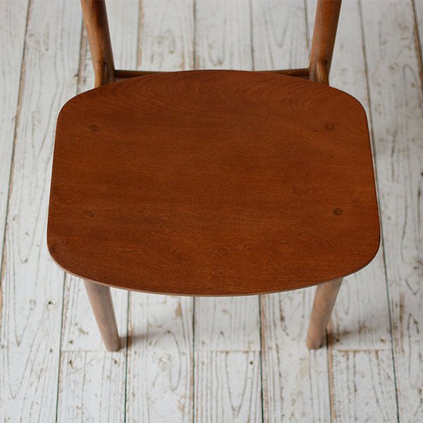 前回に引き続き自分好みのヌメ革指定にて丁寧に張り替えてもらいました。椅子本体は貴重なローズウッド材で個性的な木目と質感に満足しています。また、アームと脚の接合部分の美しさは別格です。