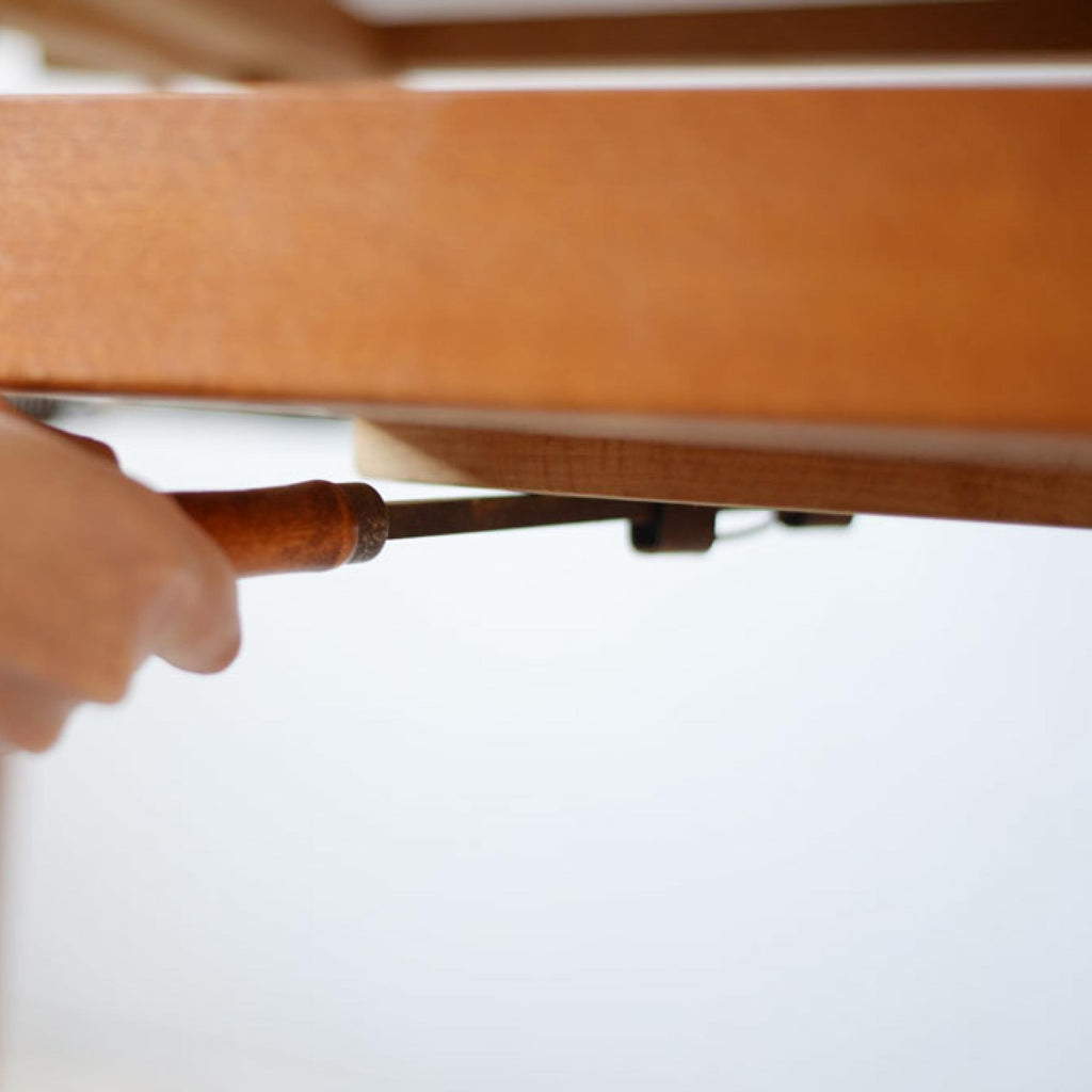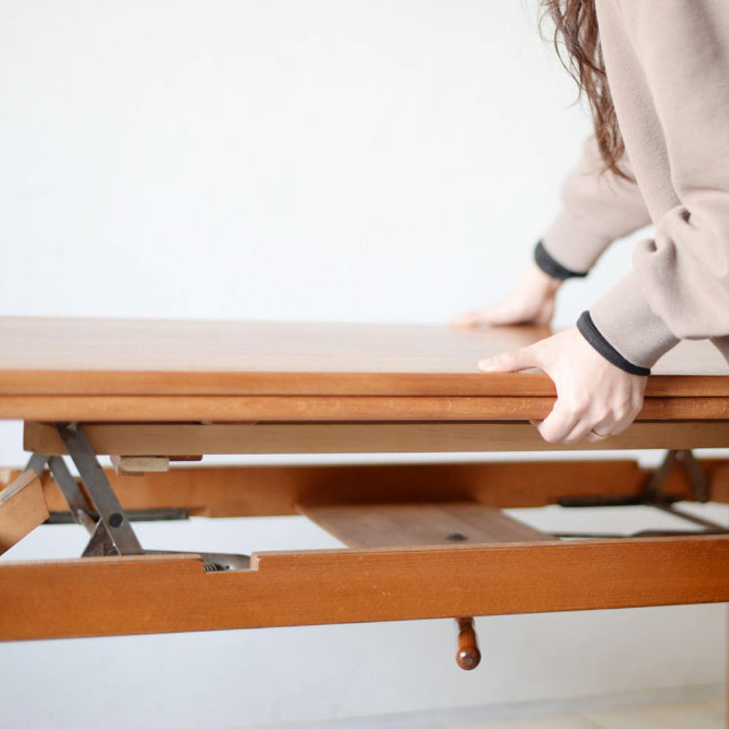 ・高さを高くする場合は天板をエクステンションごと持ち上げた後、テーブル中頃にあるレバーを一番左に動かし溝にはまるように固定します。