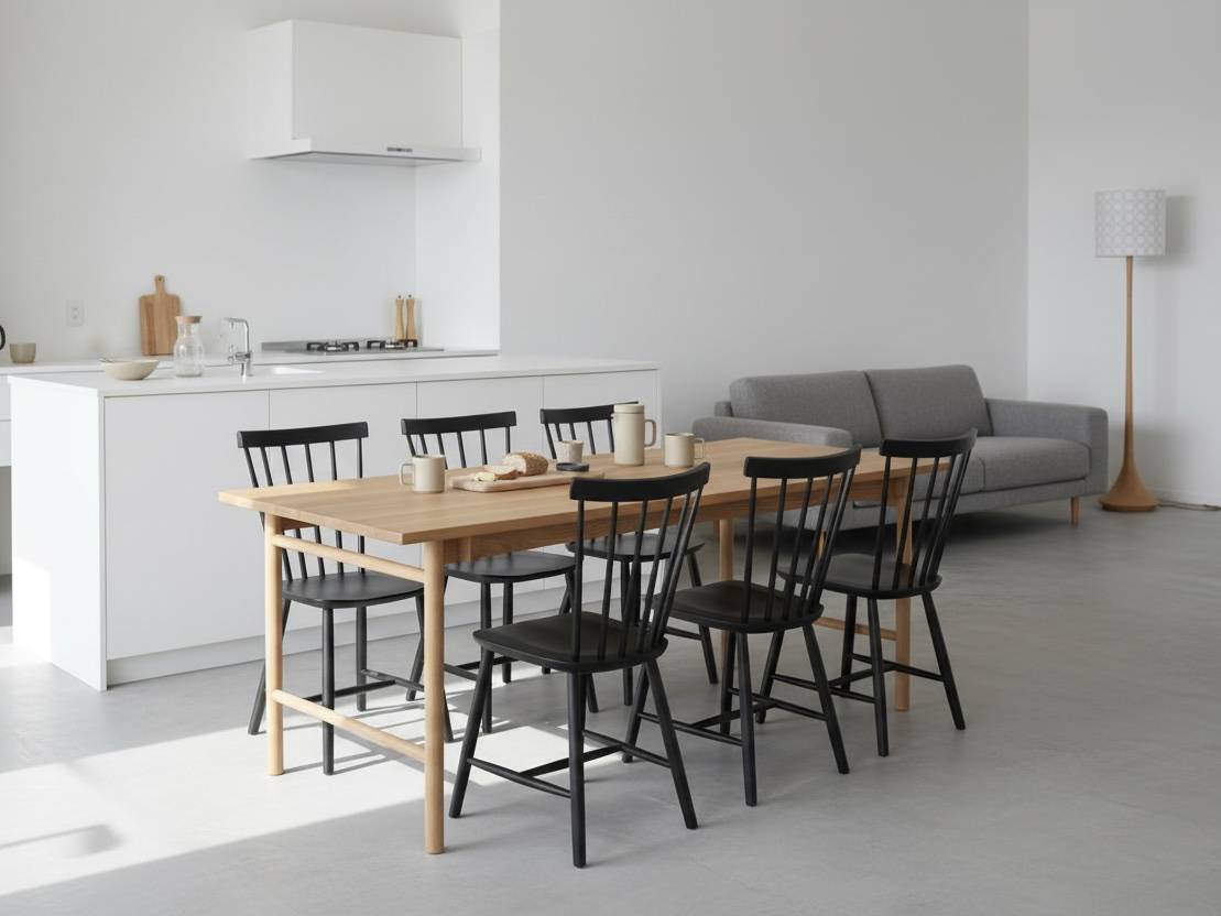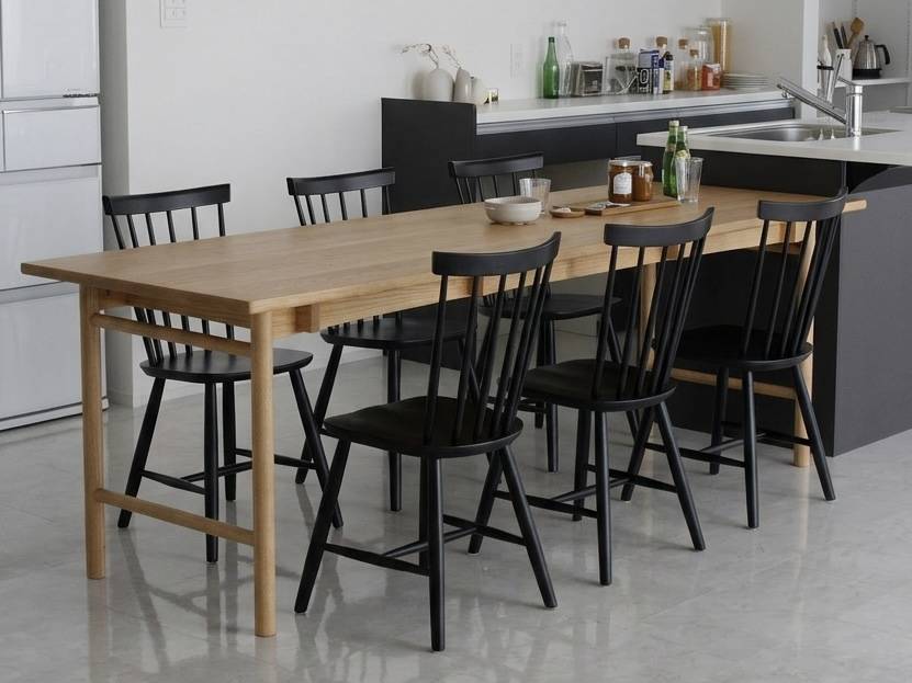 ブラックで揃えたチェアが輪郭をつくり、オークの無垢天板がやわらかさを足す。モダンな内装に、木の素材感を“きれいに残したい”方に似合うセットです。6脚が並んでも散らからず、食卓が家の中心として整います。大家族・二世帯で予算も現実的に考えたいとき、見た目の完成度を落とさずに選べる組み合わせです。